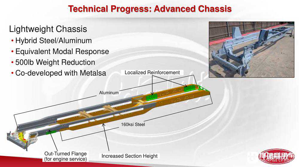 轻量化一直是美国卡车的强项,毕竟美国铝车架、铝驾驶室已经相当普及,轻量化这块一直不输。在SuperTruck2上,彼得比尔特和Metalsa为车辆设计了钢铝混合的高强度轻量化车架,减掉了500磅的死重。并且,其采用了变截面设计,为各项零部件的安装创造了便利。