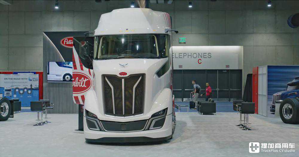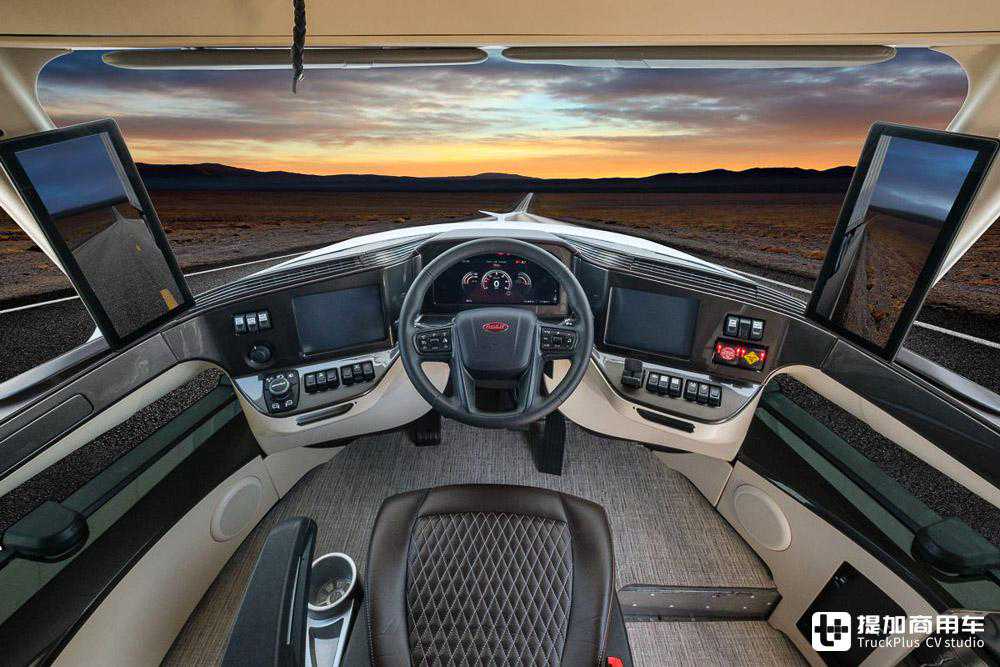 内饰方面,车辆采用了驾驶位中置的设计,更好的利用了前曲面风挡的超大视野。多功能方向盘、液晶仪表盘等控制部件都是现款彼得比尔特卡车在用的款式,A柱上附加有两块屏幕,用于显示电子后视镜的画面。