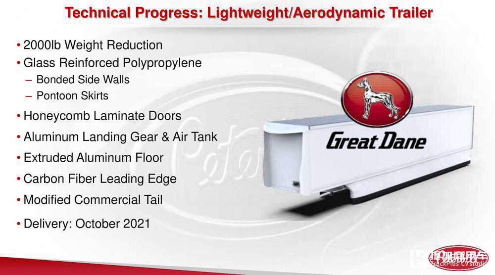 在挂车方面,彼得比尔特和GreatDane合作,开发了一款适配于SuperTruck2挂车。该挂车采用铝制车架、支腿及储气罐,侧墙采用玻璃纤维材质,并且边缘、后门等地采用了多种不同的轻量化材料,整体减重高达2000磅。