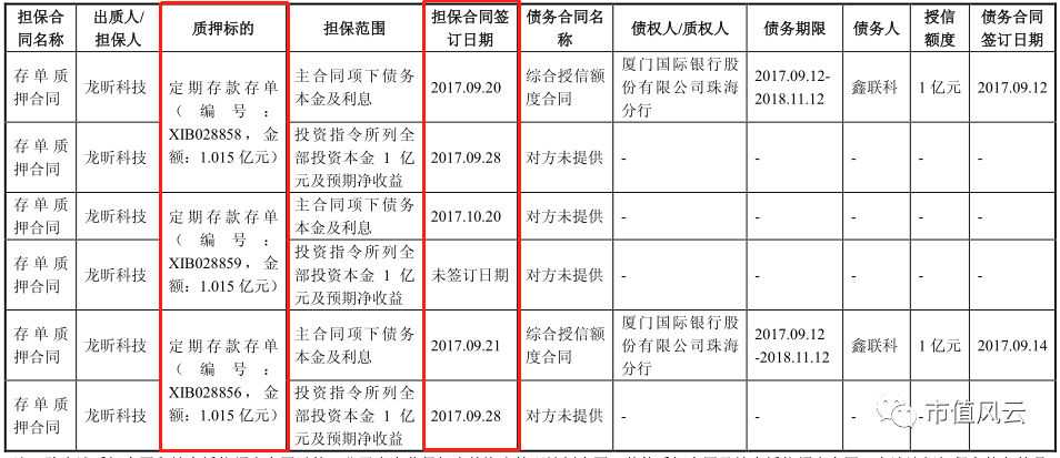 廖良茂未经董事会和股东会批准,私自以龙昕科技在厦门国际银行的3.045亿元定期存单为深圳市鑫联科贸易有限公司向厦门国际银行的3亿元授信贷款及资产管理计划提供质押担保;私自以龙昕科技的名义为其个人6,600万元民间贷款提供保证担保;根据仲裁申请书,廖良茂及龙昕科技作为被申请人,被要求对第三方舒魁3,400万元的民间借贷承担连带保证责任。