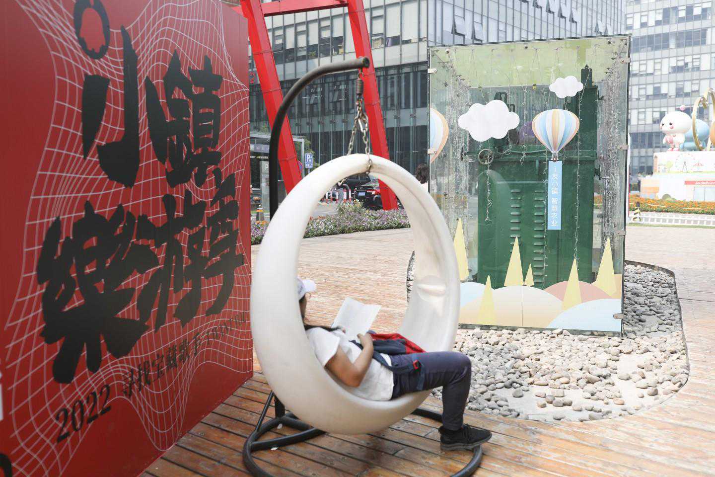 9月30日,中关村东升科技园,一位女士在园区的公共区域看书,旁边是保留下来的东升纱布厂的老物件。新京报记者浦峰摄