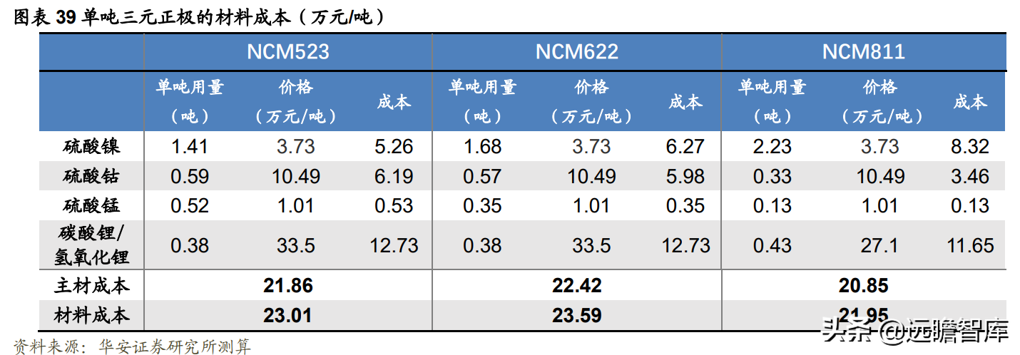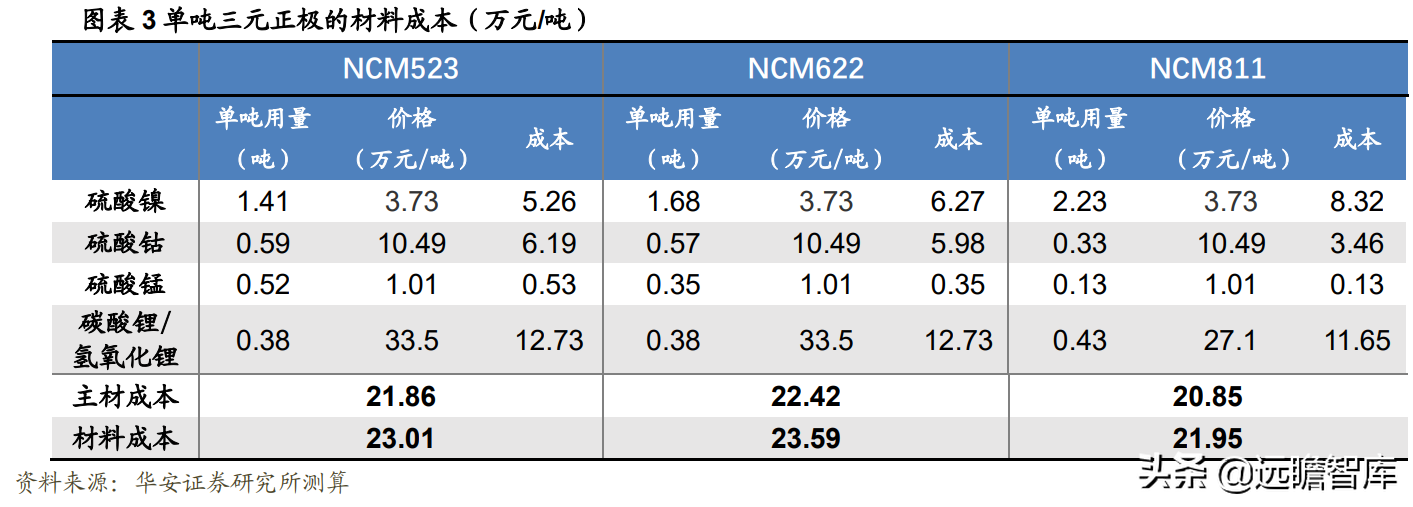 2)单位GWh三元电池分别消耗811正极1650吨、622正极1850吨、522正极1910吨。