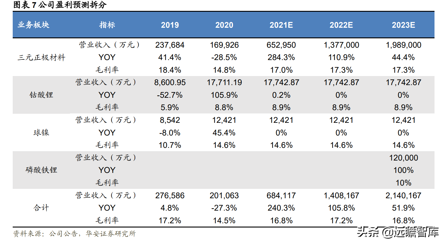 我们预计公司2021-2023年三元正极毛利率分别为17%、18%、18%。另外,公司前驱体已全部转为自供,我们预计该业务不再产生销售收入。