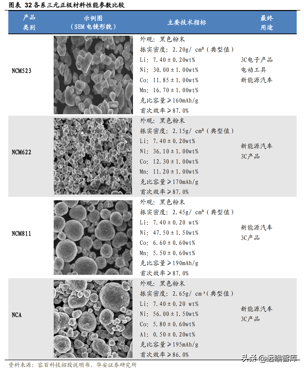 2)产品种类多:针对下游应用正极材料种类多样,既有针对下游电动工具和消费锂电的钴酸锂,也有主要应用于客车和一部分乘用车的磷酸铁锂和锰酸锂,还有主要应用于乘用车的三元材料;正极材料又是制约动力电池能量密度、稳定性、循环性能和成本最关键的电池材料,其技术的更新迭代也导致了产品的多样性。三元材料根据镍含量的不同又分为5系、6系、8系和NCA,为了提升现有正极材料的性能,正极厂商又针对5、6系产品开发出高电压和高功率等不同类型的产品。无钴材料、四元材料、镍钴锰酸锂等新型正极材料还在开发问世的过程中。