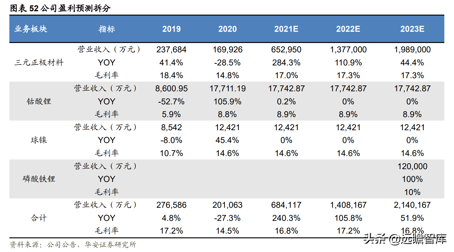 2、钴酸锂正极材料和球镍:公司对钴酸锂正极与球镍无扩产计划,因此我们预计这两项业务的营业收入保持在现有水平。