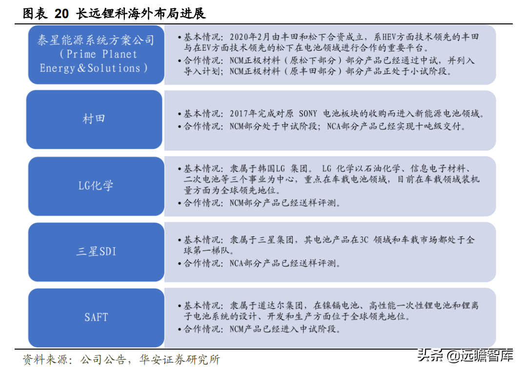 国内厂商如当升科技很早就进入海外主流供应链,能够享受到较高的价格和较优的商业条款,长远锂科也与丰田、村田、三星SDI和LG化学等进行了密切的交流和认证导入工作,目前已经有几款产品定型并进行小批量供货,未来有望拓展海外客户,抢占海外市场份额。