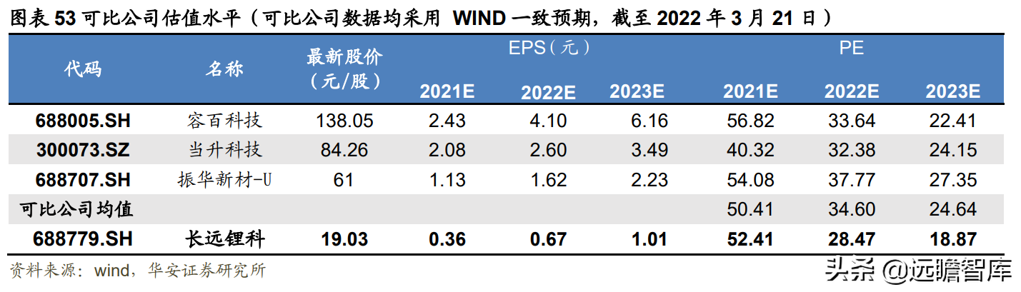长远锂科所处行业为锂电正极材料,我们选取容百科技、当升科技、振华新材作为可比公司,2021/2022/2023年的平均估值分别为50x/35x/25x。