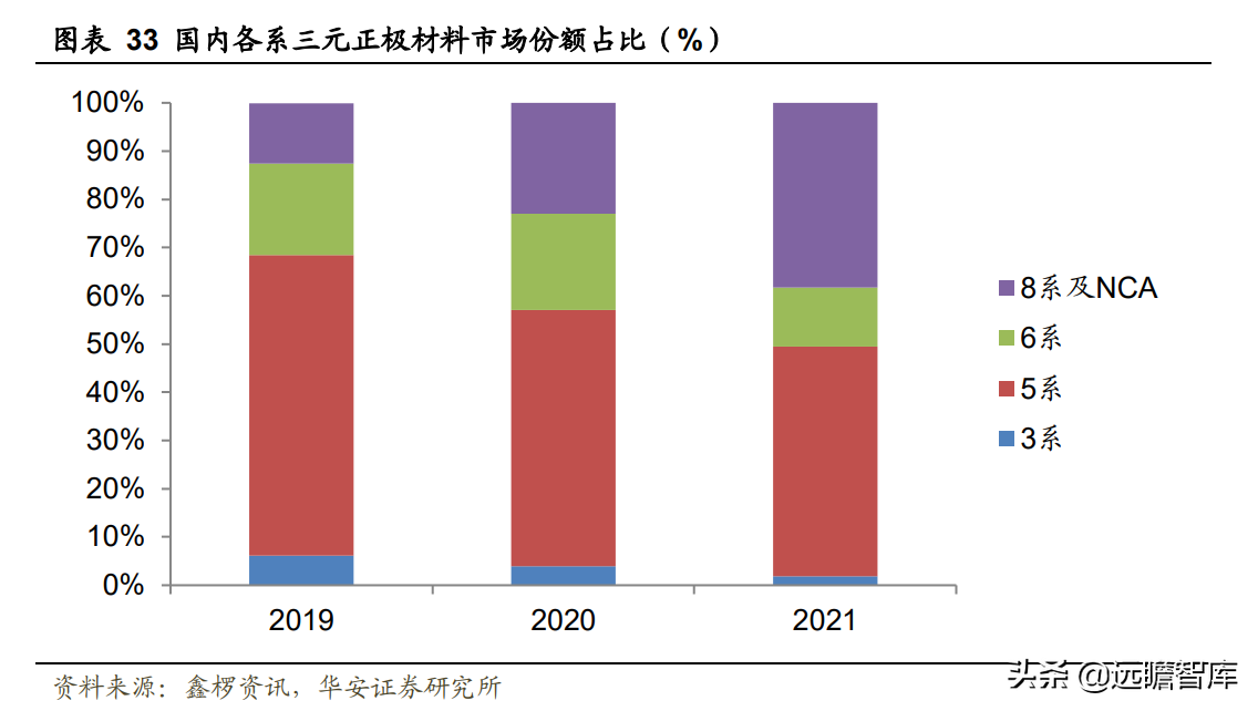 2021年国内高镍材料(811及NCA型)总产量达到15.23万吨,同比增长222.4%,市场份额从2019年的12.5%快速提升至38.3%,增长迅速。