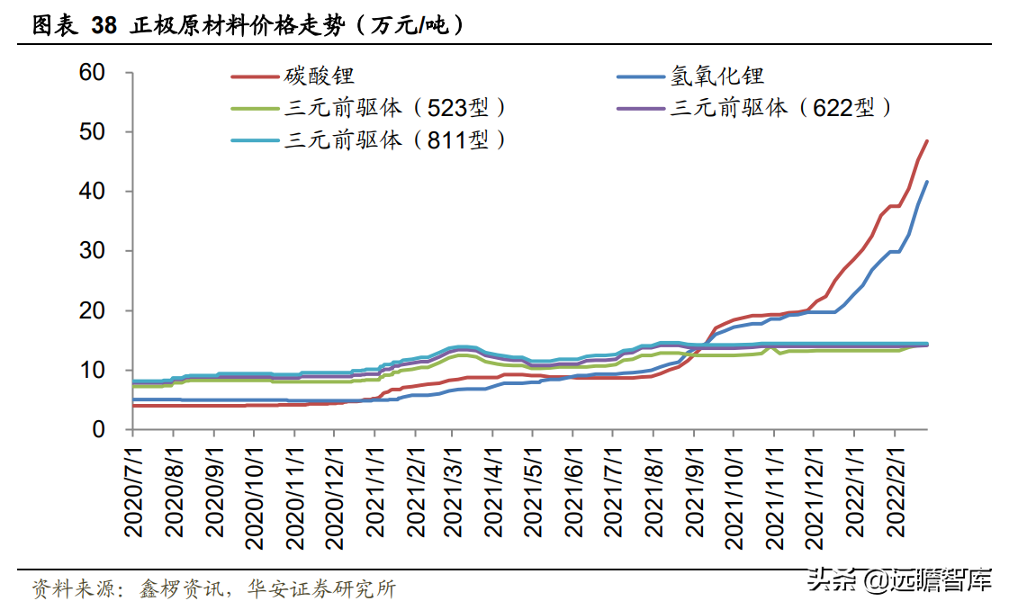 三元正的原材料主要有三元前驱体及锂盐。而前驱体是由硫酸钴、硫酸镍、硫酸锰混合制备而成,2021年三季度以来,前驱体价格总体平稳,反观锂盐价格涨势十分显著。