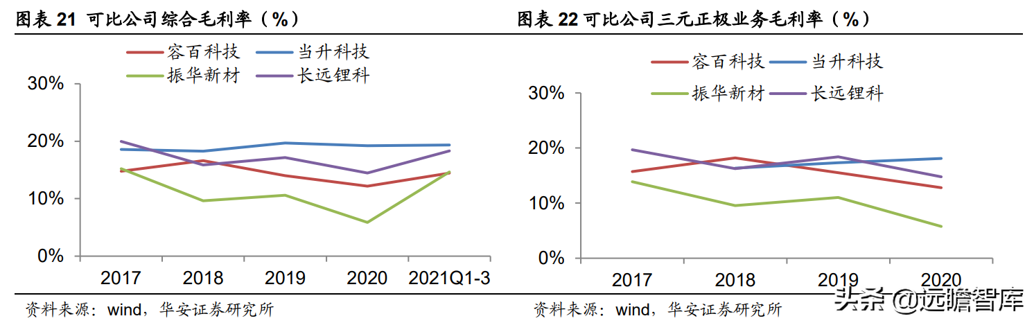 2017-2020年,公司主营业务三元正极材料的毛利率分别为19.69%、16.25%、18.41%和14.78%,处于行业较优水平。