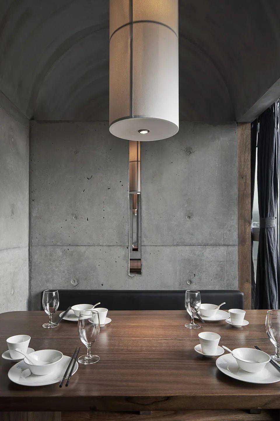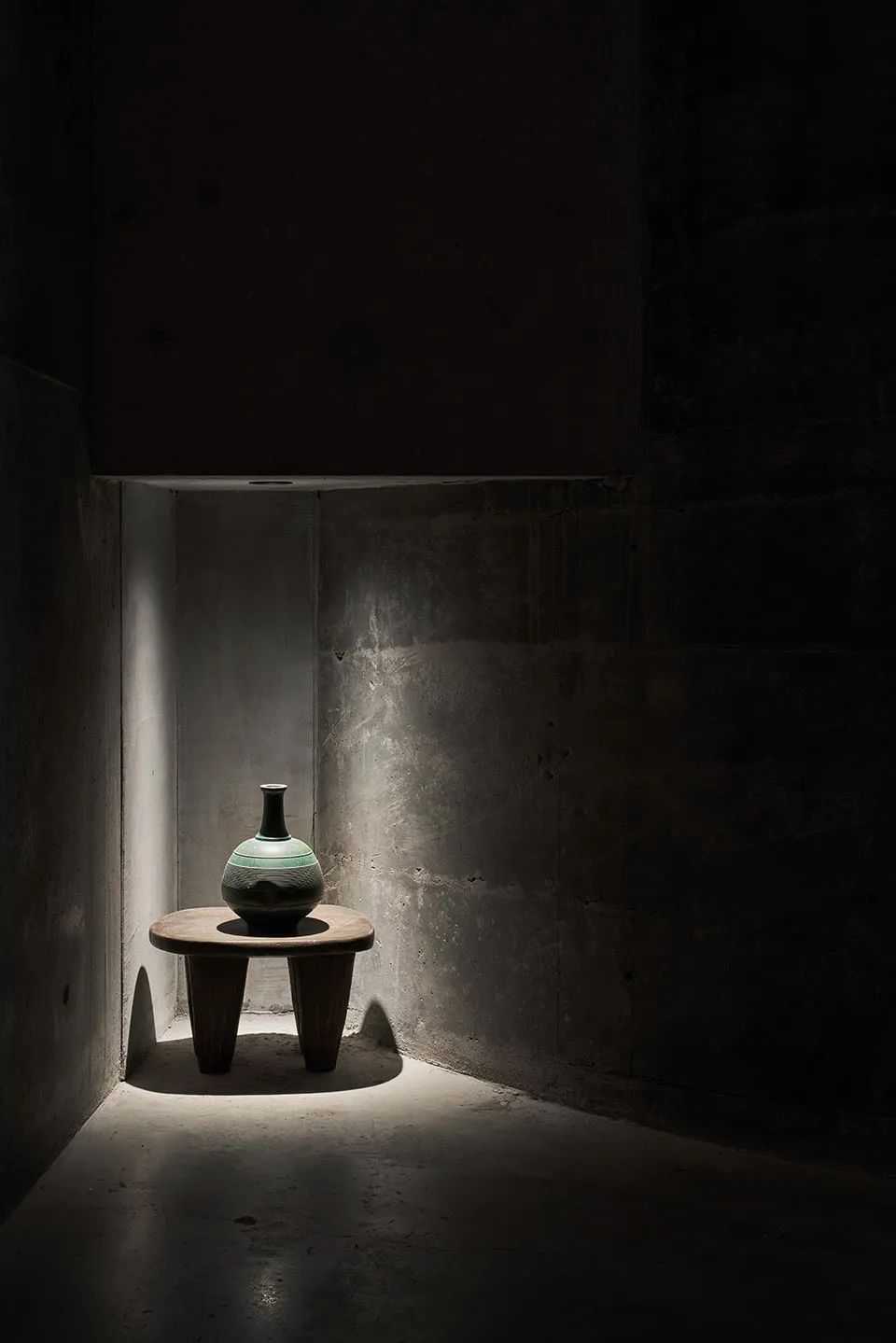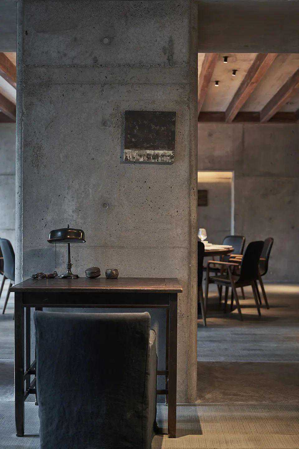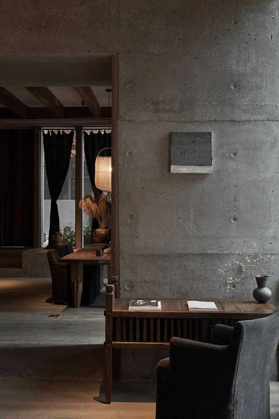 过道:光与影的融合,尽显寂静质朴之美。空间整体风格运用单色调,搭配精致而细腻的摆件,用宁静、精致取代单一色调空间的沉闷和乏味。空间采用进口古董老家具,搭配原始清水混凝土的自然肌理,化繁为简,为空间营造一种舒适、自然、简朴的就餐环境。