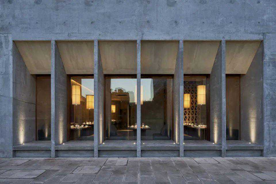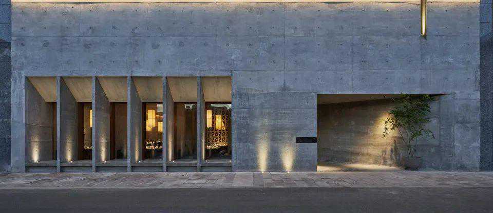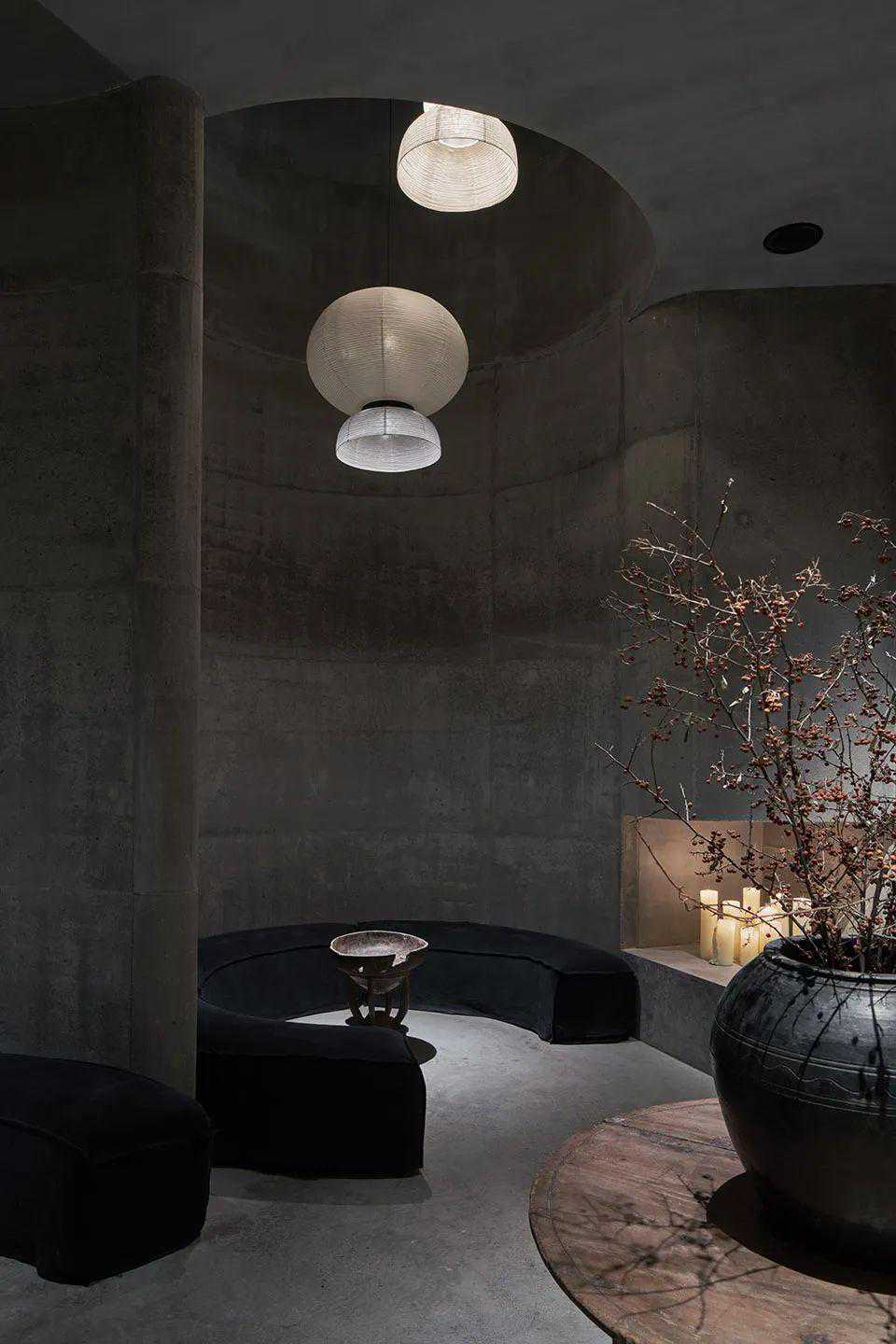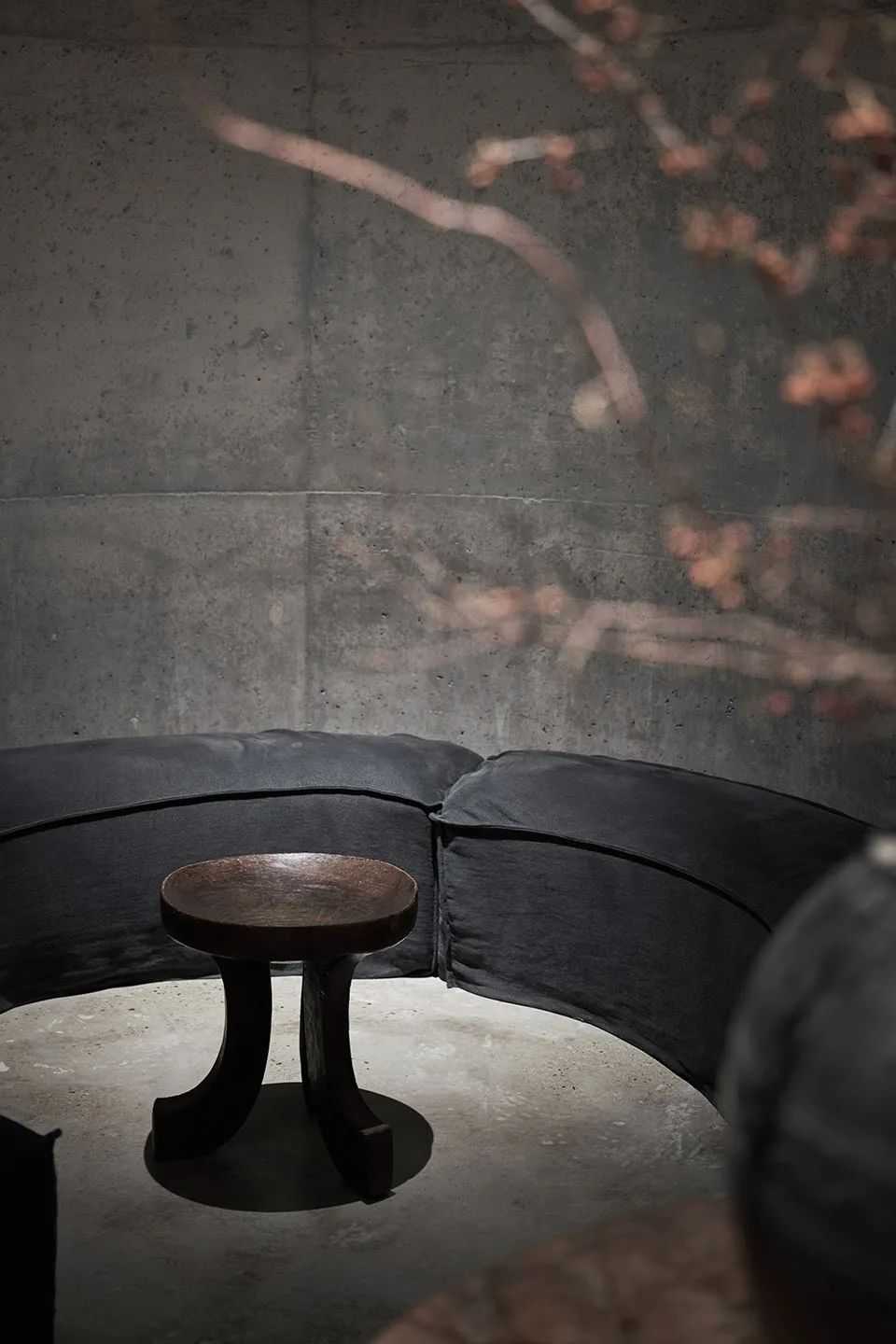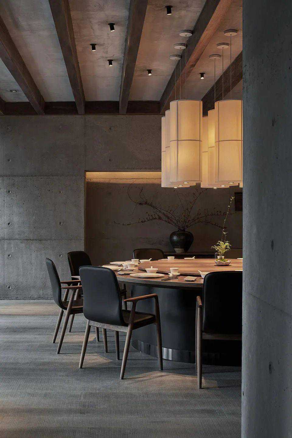 过道:光与影的融合,尽显寂静质朴之美。空间整体风格运用单色调,搭配精致而细腻的摆件,用宁静、精致取代单一色调空间的沉闷和乏味。空间采用进口古董老家具,搭配原始清水混凝土的自然肌理,化繁为简,为空间营造一种舒适、自然、简朴的就餐环境。