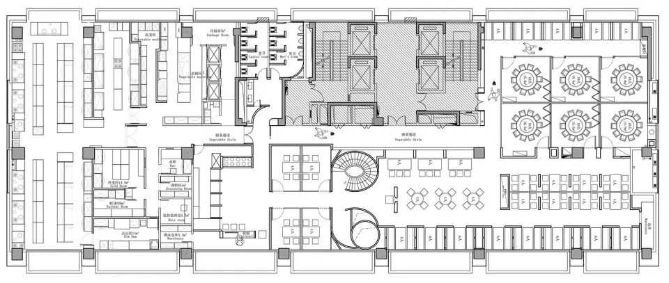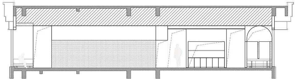 散座区:设计师注重光影效果的打造,运用镂空几何砖,既能与清水混凝土的肌理统一,同时又能引进光影效果,增加趣味性,使散座区域既开放又私密,保证顾客的用餐体验。