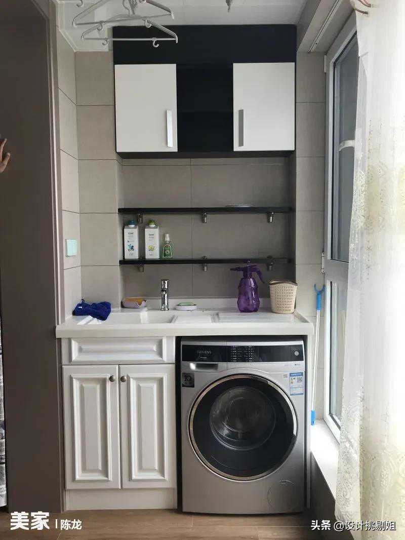 小户型的阳台设计成生活家务区,集洗烘+晾晒+收纳+清洁功能于一体,非常实用!