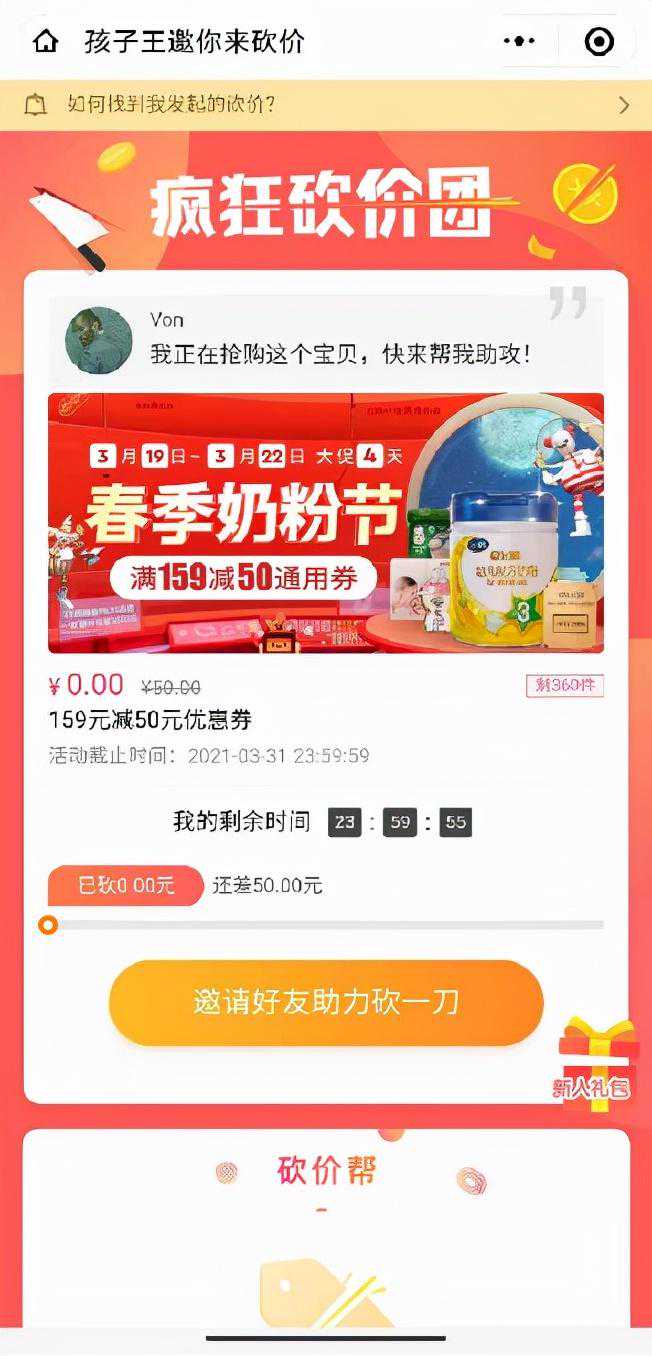 其二,通过邀请好友砍价的方式,只有砍完了,用户才能获取优惠券,助力的好友想获得优惠券,则需要重复相同的操作。