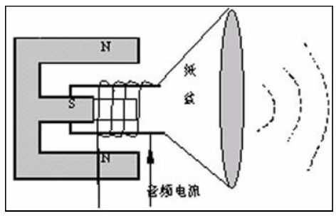 工作原理:动圈式扬声器是利用电流在磁场中受到磁场力作用的原理制成的。如下图所示,绕在纸盆上的导线构成的线圈处于同心圆盘形(截面是E形)磁铁的磁场中,放大器送出的音频电流通过线圈,纸盆在磁铁的磁场驱动下就振动起来,纸盘上的鼓膜产生音频的振动,从而使鼓膜周围的空气振动起来而产生声音。