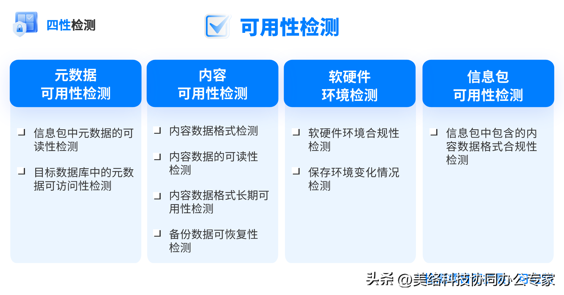 包括电子文件内容、元数据、软硬件环境等是否可用等检测项目;具有完善的数据备份与恢复机制。