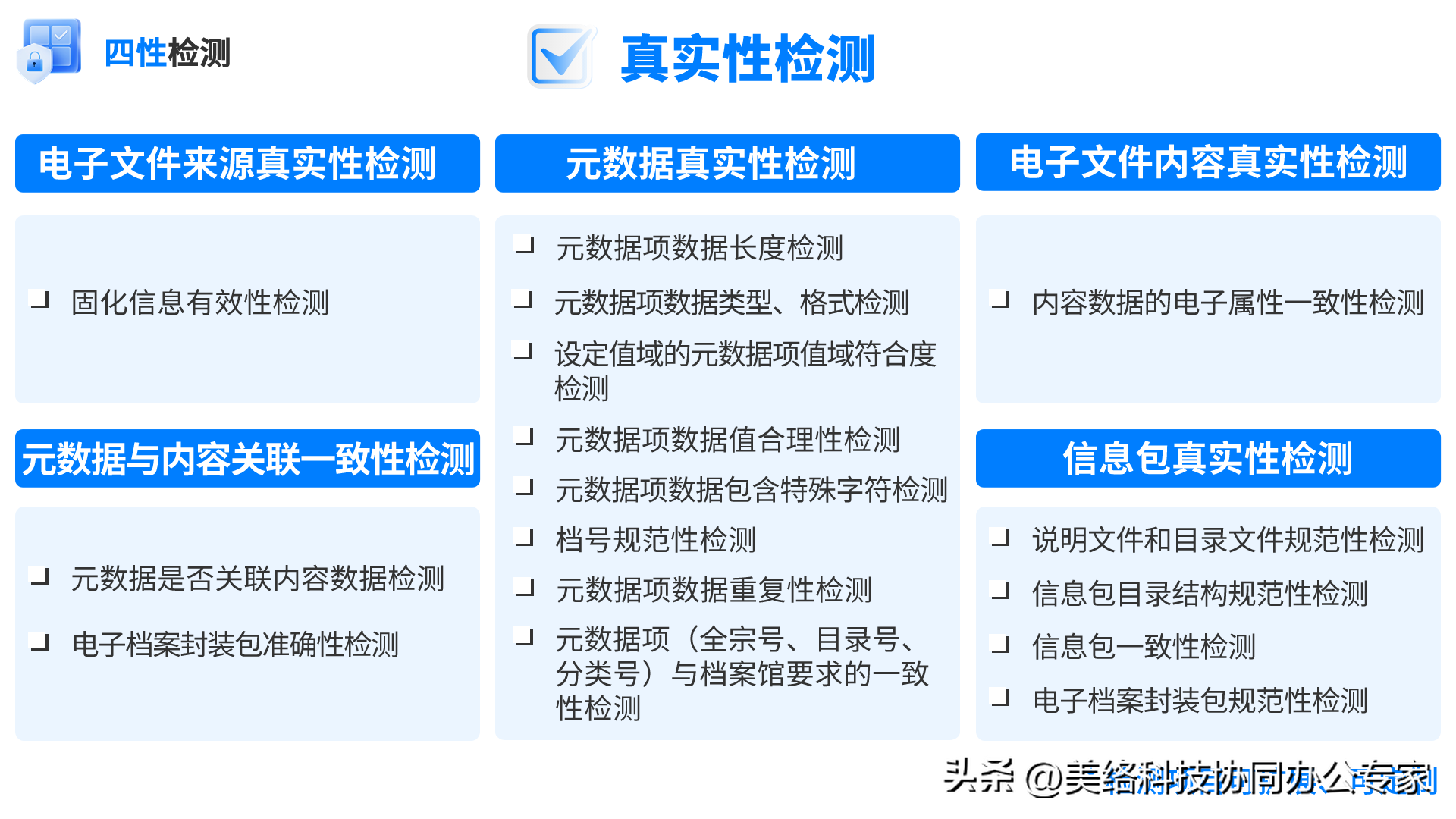作为文档一体化平台服务厂商的美络科技,根据多年档案数字化项目实践经验提出了解决方案,帮助组织对电子档案进行四性检测、层层把关,提高工作效率。