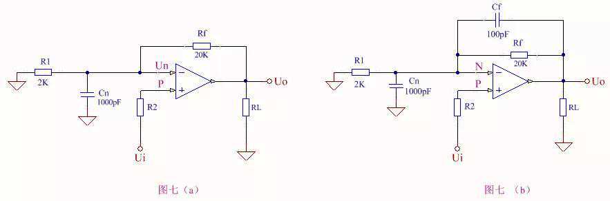 图七(a)中的Cn为反相端意外引入的等效电容,对输出信号Uo而言,Rf、Cn构成低通滤波器,造成了Un延迟变化,补偿办法是在Rf两端并联补偿电容Cf,如图七(b)所示。对Uo来说,Cf、R1又构成了高通滤波器,Cf是加速电容,补偿了Un的滞后效应。Cf的取值原则是Cf*Rf=R1*Cn,即Cf=R1/Rf*Cn;实际上,当测试发现振铃或振荡时,我们并不知道产生的具体原因,因此在设计PCB样板时,一般要预留补偿电容Cf的位置,开始先不焊接,如发生振动,经初步分析原因后,从小到大尝试添加皮法级电容,直至振铃、振荡消失。