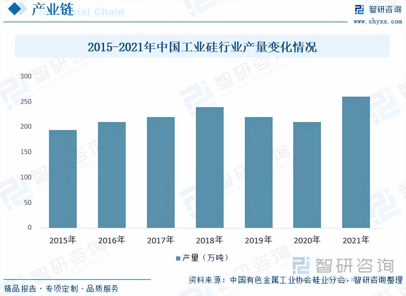 工业硅是光伏级三氯氢硅的主要原料之一。如果工业硅的产量不稳定或供应不足,将会影响光伏级二氯氢砖的生产能力和供应链的稳定性。因此,工业硅产量的增加可以确保光伏级三氯氢硅行业的原料供应充足,促进产业的发展。根据数据显示,2021年中国工业硅行业产量为261万吨。