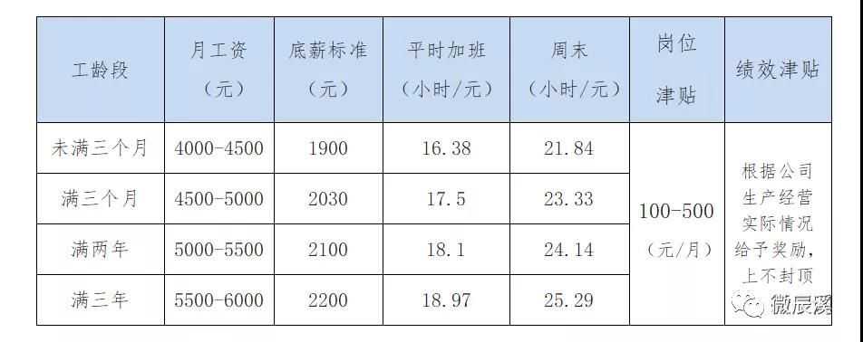 1.底薪:1900-2200元/月。试用期1900元/月、转正2030元/月(1-3个月)、满2年2100元/月、满3年2200元/月。