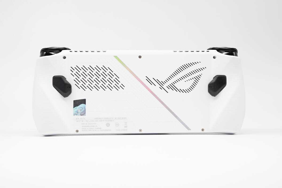 ROG掌机背面两侧拥有自定义背键:M1背键、M2背键,拥有更高的自定义性;同时,一条镭射线反光条区域分隔,左侧为【进风口】开孔,右侧的【进风口】开孔为“败家之眼”图形。同时,左下角拥有相关参数贴纸。