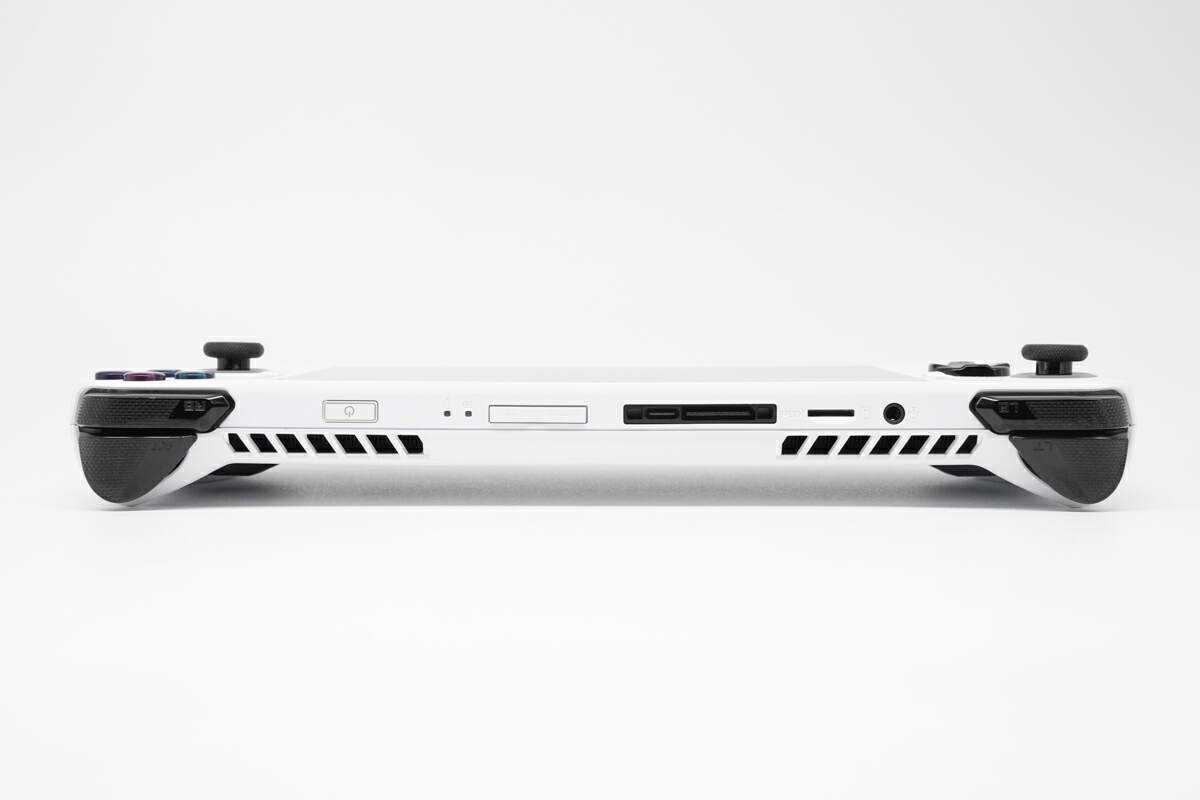 ROG掌机整体为纯白简约风格,正面拥有一块定制的7英寸1080P120Hz的16:9原生触摸横屏,支持随意滑动输入、VRR可变刷新率等,同时,屏幕采用康宁大猩猩DXC涂层,阳光下观看也能更加清晰。