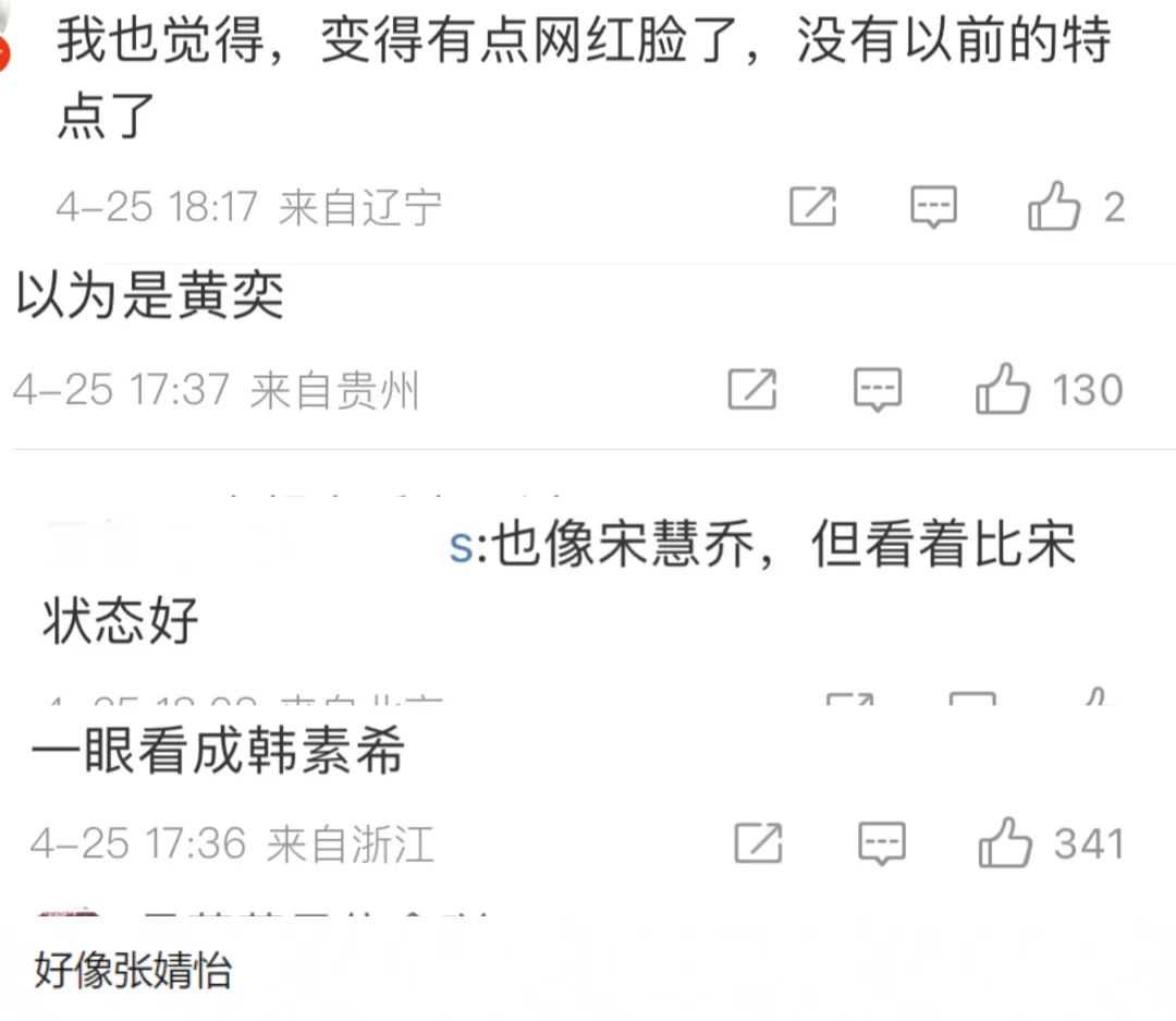 即便在她微笑时,滤镜也挡不住眼角的细纹,但这些小小的瑕疵丝毫不影响她的颜值水准。虽然有很多人惊艳于她现在的状态,但也有另一些网友直言现在的刘涛美倒是美,只是缺乏辨识度,乍一看感觉撞脸多位女星,包括张婧怡、黄奕,甚至还有两位韩娱美女——韩素希和宋慧乔。对比刘涛和这几位女星,确实有一些神似。或许正是因为这个原因,大家才认为如今的刘涛颜值水准提升了,辨识度却下降了。