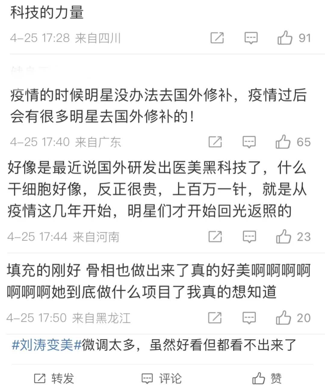 对此,一些网友直言刘涛满脸科技感,甚至认为她在这段时间进行了闭关微调,更有知情网友透露,最近众多女星集体颜值回春的原因就是因为某种医美项目,整个项目效果极佳,能够发挥重返童颜的效果,但是价位同样不容小视,起价就要一百万。当然,这个价位对于明星而言,并不是什么太大的挑战。此外,还有网友在线咨询,想了解刘涛究竟是通过什么方式,才能让颜值回春的。