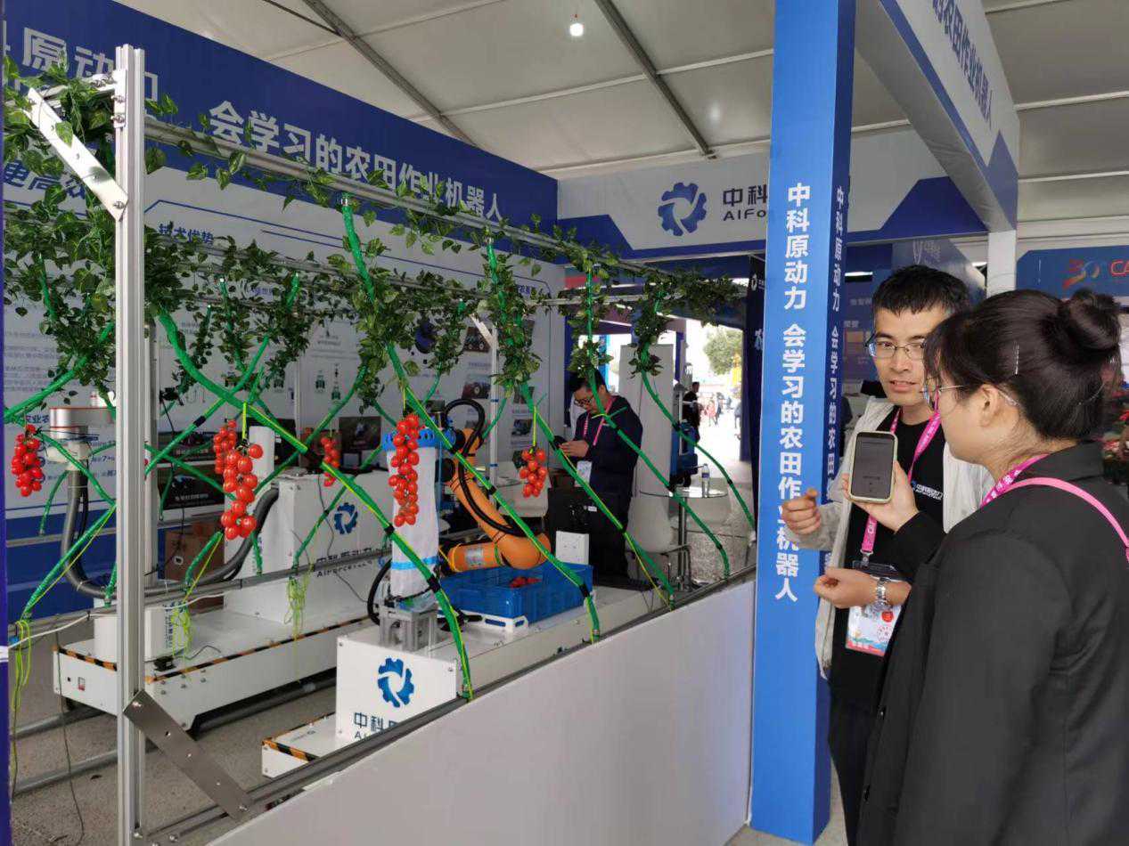 在北京中科原动力科技有限公司的展位上,“会学习的农田作业机器人”宣传语吸引着参会群众的目光。记者看到,参会群众扎堆围着一款番茄采摘机器人评头论足。这款机器人“手臂”有规律的挥动着,在对“眼”前的果实进行精准识别后,“轻而易举”的就完成了采摘任务。