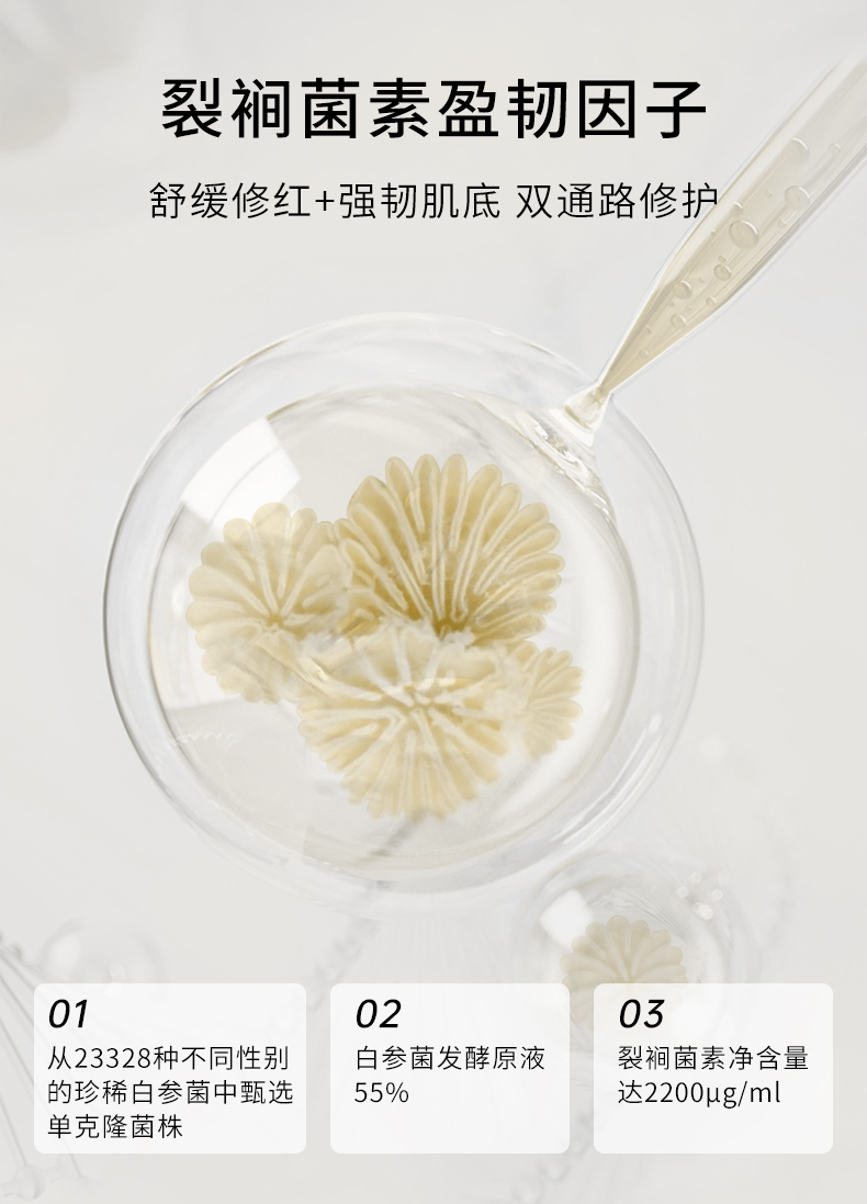 BHY泊赫言肌源臻萃精华液的研发,在不断的试验过程中,我们利用智慧护肤的科技手段,在23328种不同性别的生物活性菌株(裂裥菌)中优选出单克隆菌株,并将其转为一种高效的肌肤盈韧因子。它不仅能渗透之肌肤肌底层,深入修复受损肌肤,提升自身屏障力,唤醒肌肤的光彩。它蕴藏着强大的“护肤”力量,不仅是一种成分的转化,更是一种让肌肤美丽得以重生的秘钥。