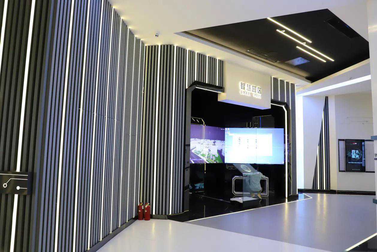 ⑷可见光通信展示:可见光通信是河南省四大重点发展产业,因此,园区在展示区和办公区部分展示可见光通信的技术成果,包括智慧党建、虚拟图书馆、智慧货柜机、虚拟培训课题、光通信投影仪等。