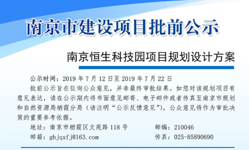 近日,南京市规划局公布《南京恒生科技园项目规划设计方案批前公示》。