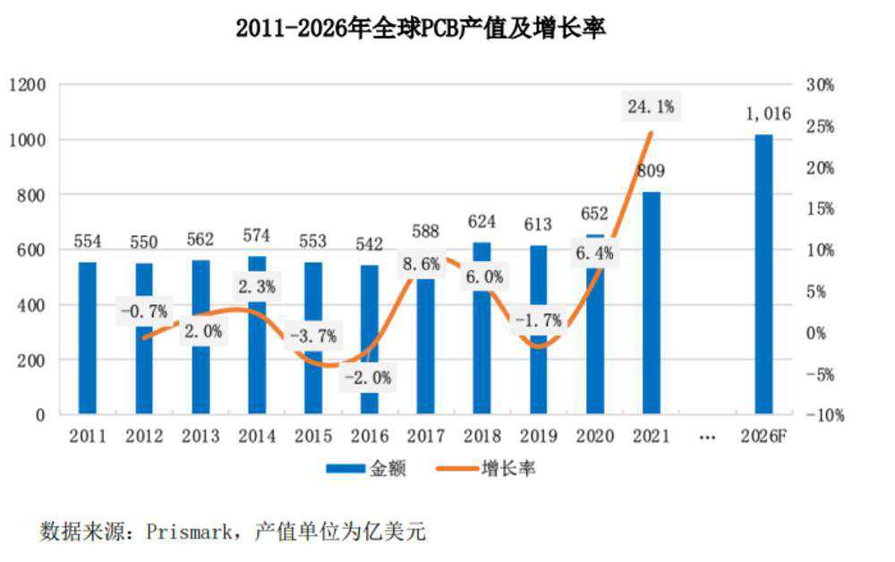 中国大陆PCB产值占全球PCB总产值的比例已由2000年的8.1%上升至2021年的54.6%,PCB的产量和产值均居世界第一。根据Prismark此前的预测,未来亚洲将继续主导全球PCB市场的发展,而中国的核心地位将更加稳固,中国大陆PCB行业预计复合年均增长率为4.3%,至2026年总产值将达到546.05亿美元。