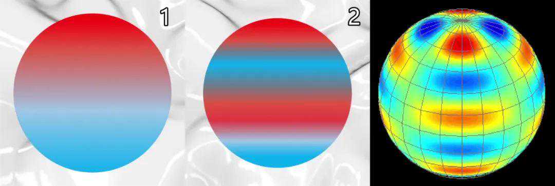 首先来看一下简单的情况,球谐函数最简单的方程是在南北极之间存在差异,如下图1所示,这相当于只波动一次的波函数。然后,我们就可以扩展更复杂的情况,南北极仍然是一冷一热,但中间又多了额外的两条冷热纹路,相当于波动两次的波函数。按照这个方式继续扩展,我们可以得到许多不同的球谐函数,具有各种波动模式。像傅里叶分析一样,当我们把许多合适的球谐函数叠加在一起的时候,我们就可以得到CMB的模式了。