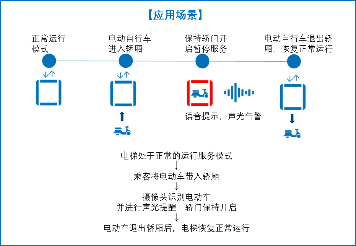 当检测到电动车时,摄像头发出语音提示,并白光闪烁,同时电梯门保持打开状态,劝阻电动车“乘梯”行为。