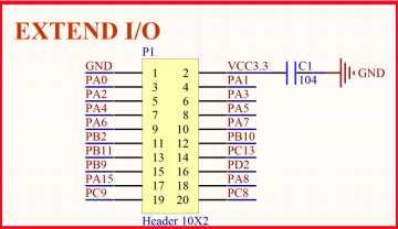 图中为MCU主IO引出口,排针共引出了18个IO口,STM32F103RBT6总共有51个IO,