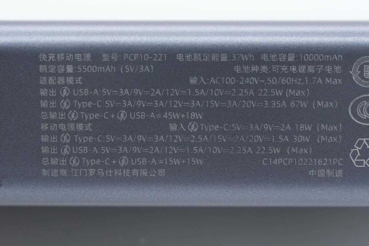 充电头网拆解总结罗马仕这款超级快充移动电源为充电器+充电宝二合一设计,内置的氮化镓充电器支持67W快充输出,移动电源为10000mAh容量,支持30W快充输出。移动电源具备1C1A输出接口,在充电器模式下支持67W输出功率,并支持45W+18W功率自动分配,充电宝模式下支持30W输出功率,满足日常手机,平板和笔记本电脑充电。