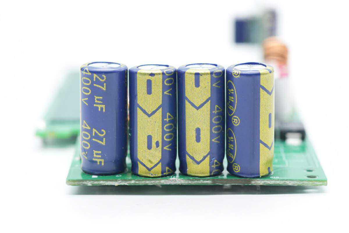 PCBA模块侧面焊接四颗高压滤波电容,电容来自昱光电子,规格为400V27μF,四颗共计108μF容量。