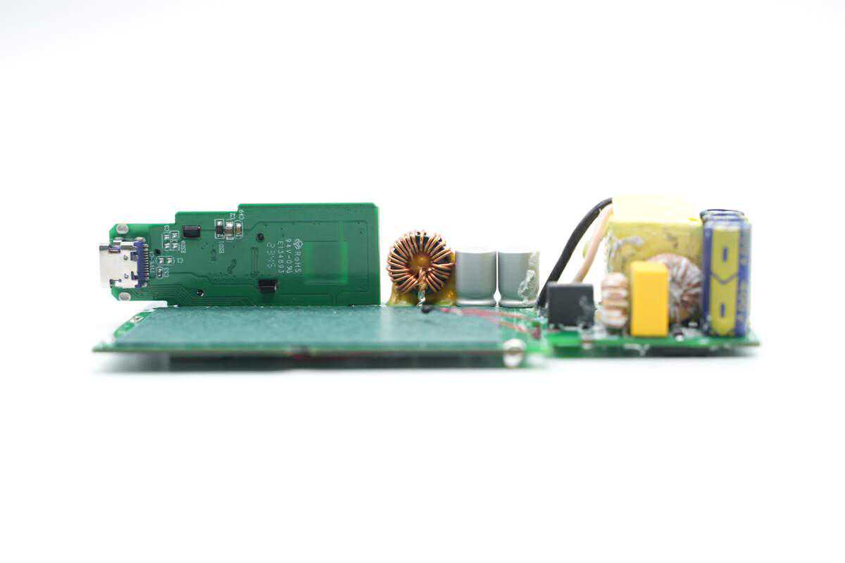 移动电源内部由氮化镓快充电路与移动电源电路组成,采用南芯科技SC3057氮化镓合封芯片搭配SC3503同步整流控制器组成氮化镓快充,使用南芯科技SC8812A同步升降压控制器用于USB-A口输出和电池充电,并使用芯海科技CS32G020K8U6协议芯片进行输出电压控制。
