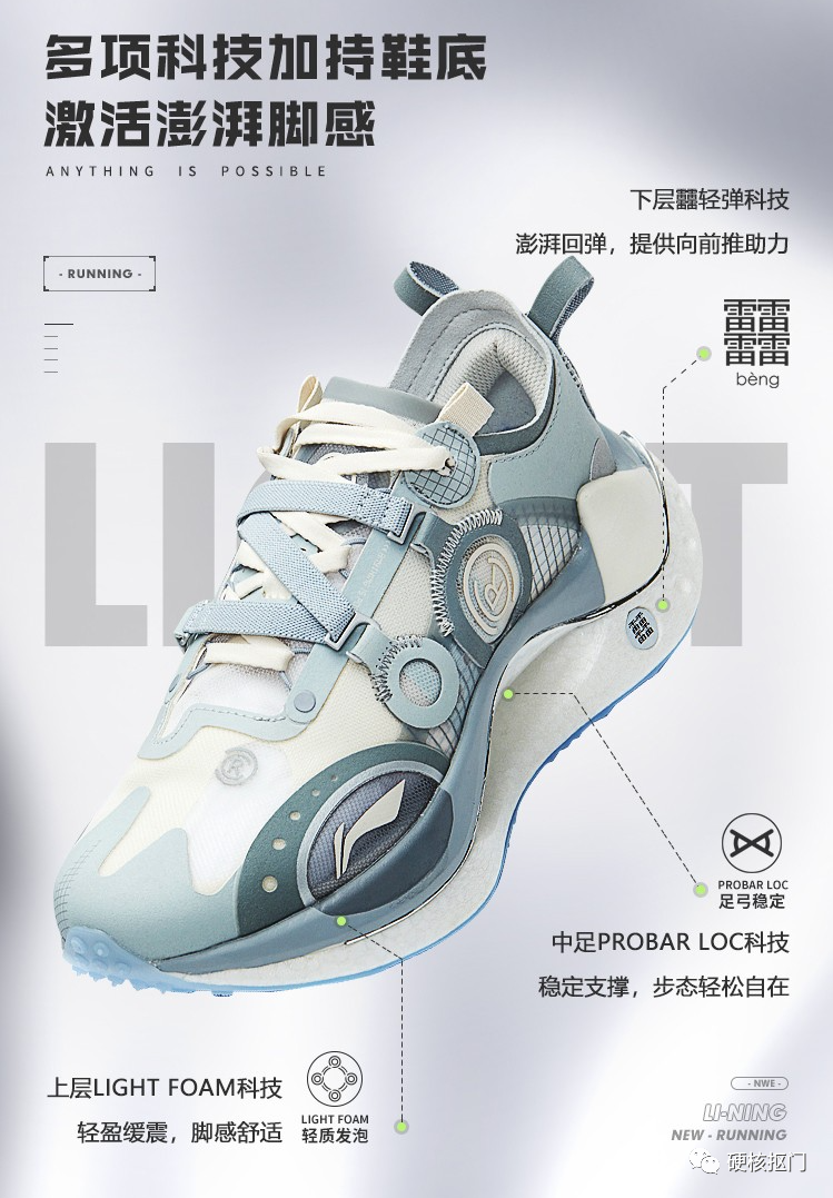 lightform科技:李宁的超轻缓震发泡材料,高分子聚合物架桥系统,主要也是轻,缓震和回弹比较好,脚感柔和。