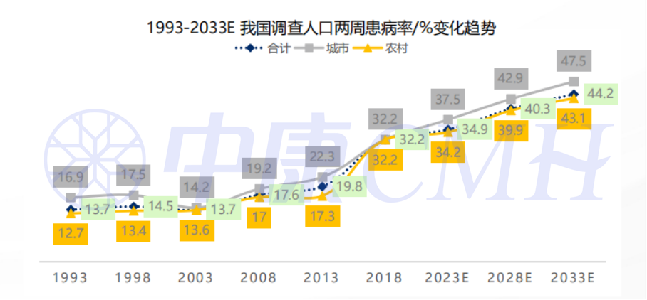 中康CMH数据显示,我国城乡居民的两周患病率均逐年提高,2033年两周患病率将达44.2%。这其中,不论城乡,高血压的患病率最高;其次是糖尿病与普通感冒。患病率前10疾病中,慢性非传染性疾病较多,尤其是老年慢性病。