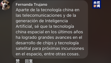 墨西哥网友费尔南达·图哈诺留言表示,近年来,除了通信和人工智能技术以外,中国的航空航天技术也得到长足发展,特别是在该领域芯片技术和卫星发射等方面取得显著进步。