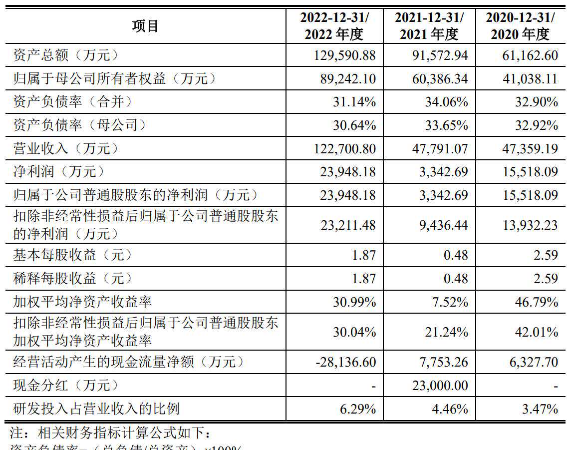 招股书显示,聚成科技2020年、2021年、2022年营收分别为4.74亿元、4.78亿元、12.27亿元;净利分别为1.55亿元、3342万元、2.4亿元;扣非后净利分别为1.39亿元、9436万元、2.32亿元。