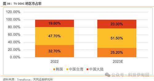 DDIC随着2023年价格基本稳定或略有下降,随着电视、游戏显示器和商用笔记本电脑等大型应用出货量回升带动DDIC需求增加。但由于持续的市场压力,DDIC价格预计将继续呈下降趋势。中国工厂的面板生产日益集中,使长期主导DDIC市场的中国台湾供货商面临巨大压力。根据Trforce数据,2022年至2023年,中国大陆TVDDIC市场份额持续增加,从19.6%提升至23.3%。