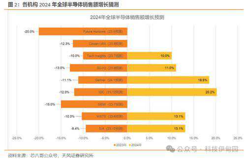 从全球半导体销售额看,2023年半导体行业筑底已基本完成,从Q3厂商连续数月的稳定增长或奠定半导体行业触底回升的基础。全球部分主流机构/协会上修2024年全球半导体销售额预测,2024年芯片行业将出现10%-18.5%之间的两位数百分比增长。其中,IDC和Gartner最为乐观,分别预测增长达20.2%和18.5%。