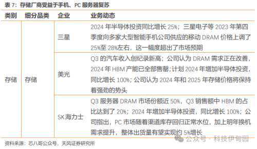 三星、SK海力士和美光存储三巨头将极大受益于消费电子的复苏。值得强调的是,在消费电子回暖的带动下,存储芯片在23Q4合约价报价优于市场预期。其中,DRAM方面,DDR5上涨15~20%,DDR4上涨10~15%,DDR3上涨10%,涨幅优于原先预估的5~10%;而在NANDFlash方面,目前每家厂商平均涨至少20~25%,涨幅比DRAM更大。