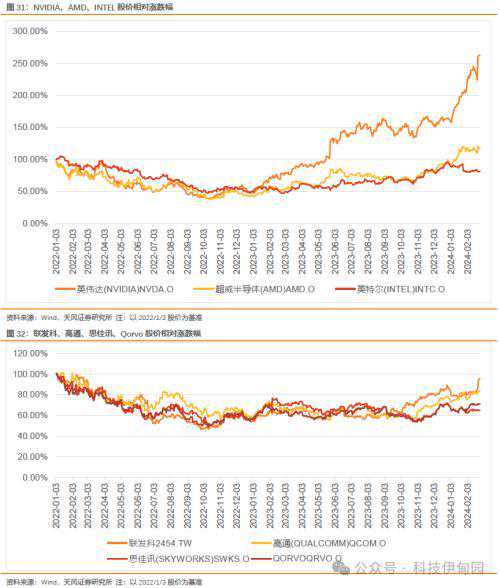 在过去的一个月(01.25-02.26)数字芯片国际厂商股价涨跌不一,其中英伟达/AMD/英特尔股价涨跌幅分别为+28.4%/-2.4%/-13%,联发科/高通/Skyworks/Qorvo股价涨跌幅分别+18.2%/+1.7%/-2.5%/+6.7%。