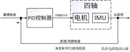 这里主要讲解的PID算法属于一种线性控制器,这种控制器被广泛应用于四轴上。要控制四轴,显而易见的是控制它的角度,那么最简单,同时也是最容易想到的一种控制策略就是角度单环PID控制器,系统框图如图所示: