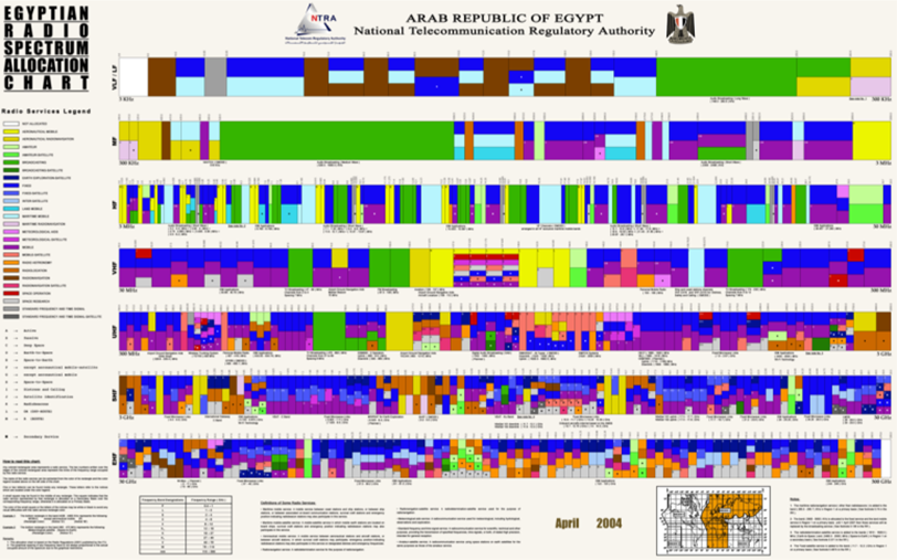 如前所述RF频谱被用于诸如卫星,GPS系统,移动通信(2G,3G和4G),FM收音机,WIFI,蓝牙等各种类型的服务中。其中一些是获得许可的,有些不是许可的,这意味着要在某个频段上运行,您必须付钱,例如移动运营商像Vodafone,Verizon,Orange等的移动服务,需要付出很多钱才能获得在预定频段中分享其服务和应用。有些频段如WI-FI和蓝牙,我们不用花钱就可以使用它们。每个国家都有一个组织来管理频谱的分配过程,下图是一个频谱分配图的例子。
